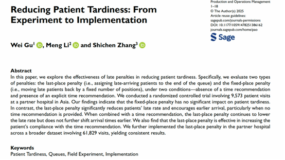 近日,风车动漫 系统工程研究所张世晨副教授作为通讯作者/共同一作的论文《Reducing Patient Tardiness: From Experiment to Implementation》在运营管理领域的国际顶级期刊Production & Operations Management在线发表。