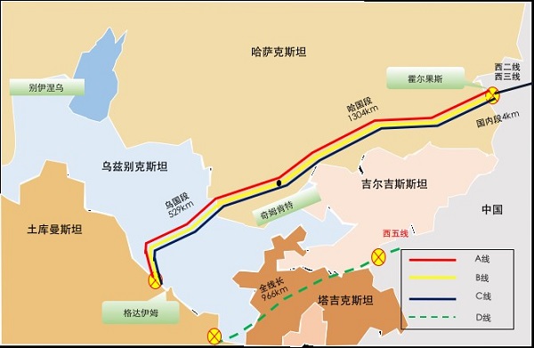 中亚跨国天然气管道是联通中亚多国与中国的重要能源战略通道,对保障中国能源安全、推进国家能源结构绿色转型具有重要战略意义。中亚跨国天然气管道项目包括ABCD四条线,2007年8月起陆续开始建设,仅AB线建设投资就达99亿美元。ABC线并行敷设,单线长度1833公里,西起土库曼斯坦,途经乌兹别克斯坦和哈萨克斯坦,从新疆霍尔果斯进入中国,与西气东输二线、三线相连。