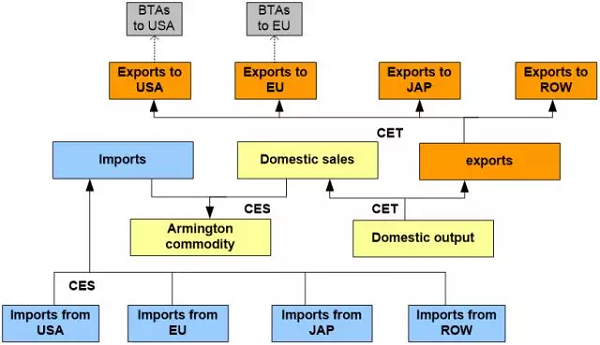 张中祥解释到,美国众议院通过的《美国清洁能源安全法案》明确对来自中国等美国认为没有采取与美国相当的温室气体减排措施国家的高能耗、初级进口产品(如钢铁、水泥和铝等)征收碳关税。根据他们建立的中国多部门动态可计算一般均衡模型,开创性地把单国模型中惯用的单一的外国账户分解成美国、欧盟、日本和其他地区四个账户(如下图),发现原来流向欧美的中国出口受到碳排放边境调节税的负面影响,但因为贸易流向的转变,采取与美国相当的温室气体减排措施国家的日本填补了中国原来在美国的市场,但中国增加了对日本的出口。因此,对中国国际贸易的影响远没有不考虑贸易流向转变情况下那么严重,同时美国征收碳关税也没有起到保护美国钢铁的目的,因为日本填补了中国原先在美国的市场。