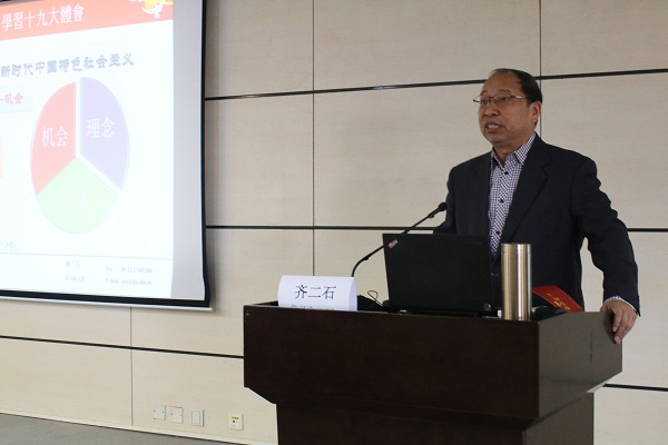 围绕中心,深化认识。第三场理论报告邀请学部资深教授齐二石老师主讲,齐老师从学习十九大精神的心得体会讲起,指出作为高校教师,贯彻落实十九大精神要注意边学习边实践,坚定信仰信念,当好人民教师,提出有中国特色的管理科学理论。最后一场理论报告邀请到延安大学公共管理研究所所长任晓林教授为师生党员上党课,任教授以“延安精神:中国共产党精神谱系的政治之本”为题,从延安精神的表达与价值,延安精神的知识图谱等角度,结合党史对延安精神进行了深入浅出的讲解。
