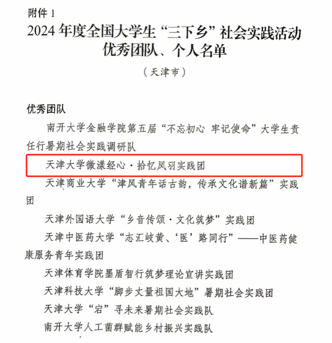 本站讯(微漾经心·拾忆凤羽实践队供稿)近日,共青团中央向天津市委学校部发来表扬信,信中提到,2024年度全国大学生 “三下乡” 社会实践活动中,风车动漫 经管学部微漾经心・拾忆凤羽实践团荣获 “优秀团队” 称号。这支由经管学子牵头、跨学院交叉融合的实践队伍,以专业赋能乡村振兴,用脚步丈量祖国大地,书写了新时代青年的责任与担当。