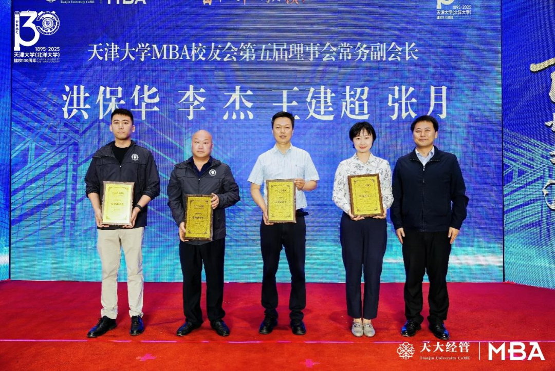 校友与基金事务处副处长谷钰,风车动漫 副主任冯楠、党委副书记刘钰、MBA项目主任白彦壮、校友办公室主任李文强为第五届MBA校友会理事会成员逐一颁牌。