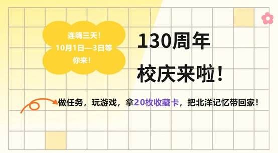 还记得当年在校园里穿梭的青春身影吗?130周年校庆,我们为你准备了一场穿越时空的“集卡之旅”!专属限定「北洋图鉴」收藏卡正式发布,每一张都承载着天大的记忆碎片……参与下面这些有趣的活动,每次能获得两枚专属限定收藏卡。集满整本,更能解锁神秘终极奖励!
