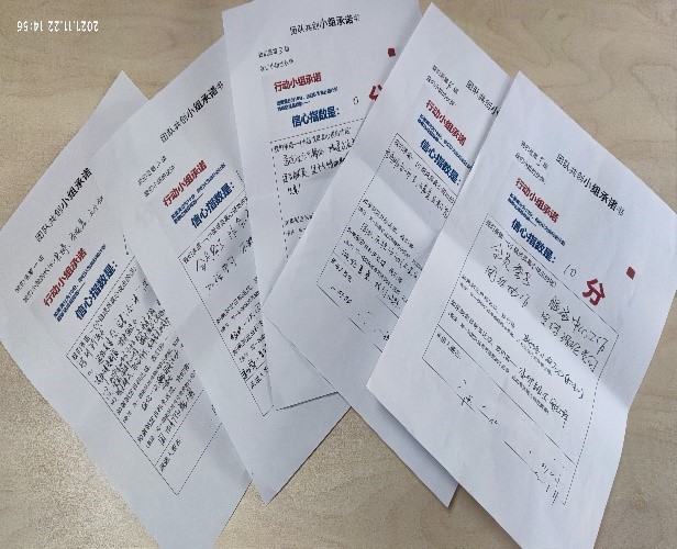 活动结束后,5个小组分别写下了小组行动承诺,明确了 “共创优秀党支部”这一目标的信心指数、达成目标的“小奖励”以及未完成目标的“小惩罚”措施。通过承诺书的形式,强化了每名党员积极落实行动、共创优秀党支部的责任意识。