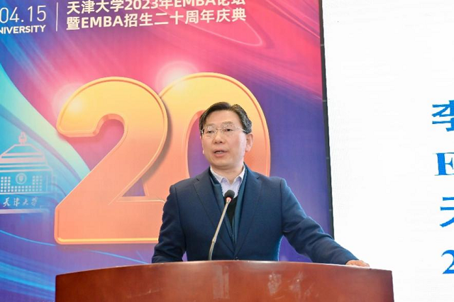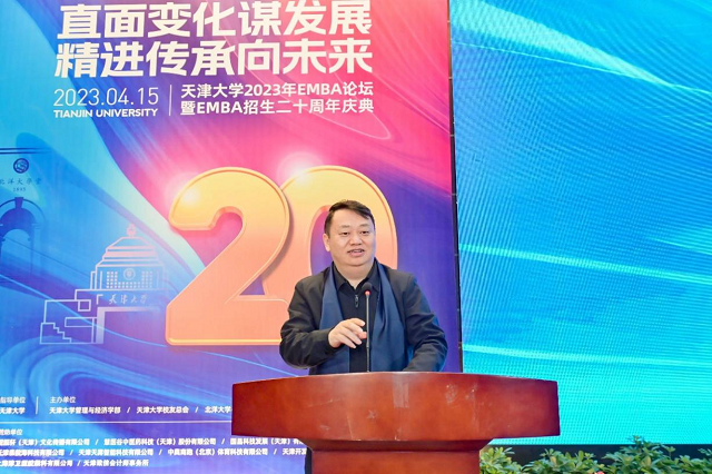 Guo Baoyin, President of Tianjin United Business and Innovation Development Promotion Association, and Chairman of Jinglan Group, on behalf of the Association, warmly congratulated the successful holding of the TJU 2023 EMBA Development Forum and the 20th anniversary celebration of EMBA enrollment. He stated that since its establishment, TJU has always had genes of cooperation and innovation. The spirit of entrepreneurship, hard work, academic excellence, and patriotic dedication has been passed down from generation to generation. Since the enrollment of the TJU EMBA program in 2002, based on the disciplinary advantages and strong faculty of the CoME, it has continuously delivered groundbreaking innovation-thinking, strong execution, and globally-minded and responsible knowledge-based talents to society. They have achieved significant accomplishments in various industries, not only with patriotic dedication but also practical actions, showing the style of "TJUers" everywhere.