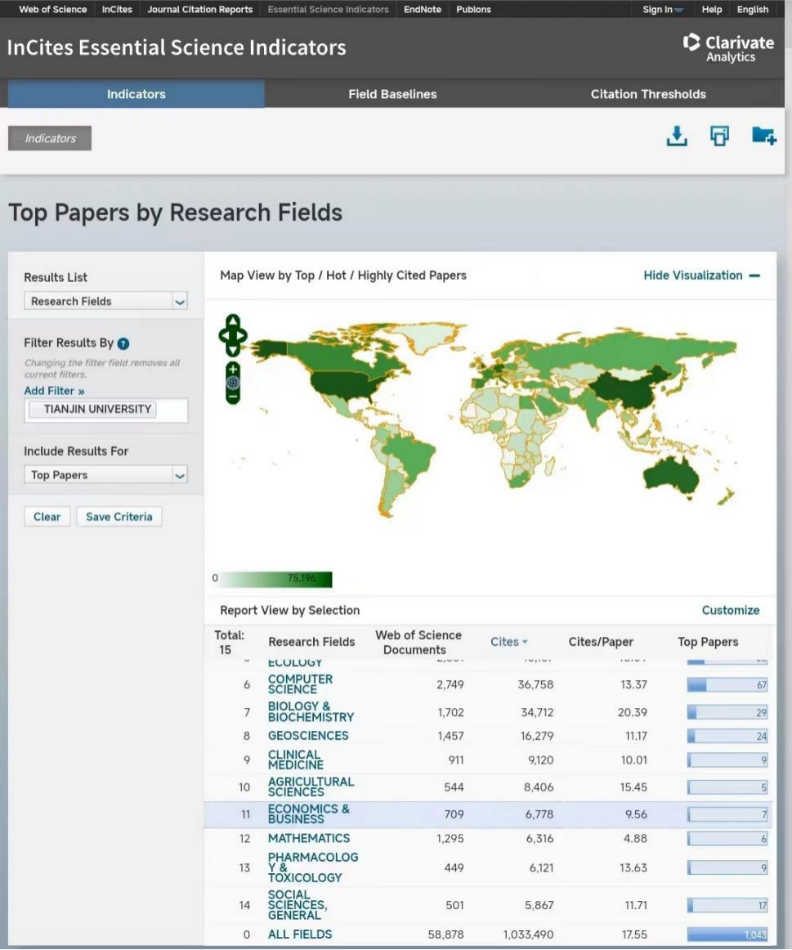 ESI is an important indicator commonly used today to evaluate the international academic level and influence of universities and research institutions, and is also globally recognized as an important reference for evaluating the development of university disciplines. The disciplines ranked in the top 1% of ESI are generally regarded as international high-level disciplines, and entering the top 1% of ESI reflects the academic influence of a research institution (including university and research institute). At present, 452 institutions in the global economics and business discipline have entered the top 1% of ESI, including 31 institutions in Chinese Mainland (Countries/Regions are China Mainland) and 6 domestic Hong Kong universities have also been selected. TJU included 709 papers, with a total of 6778 citations.